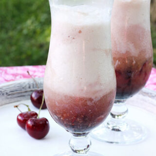 - Slice the cherries into quarters, and add 24 quarters to the bottom of one glass.