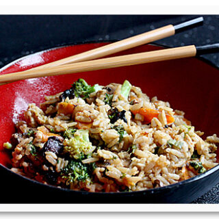 This is Uncle Ben’s Whole Grain Brown Rice. Yummy and quick. It cooks while SoupAddict is slicing veggies with blazing speed and frying them up in her wok.