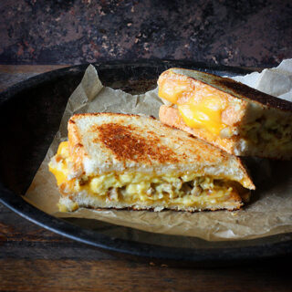 And that’s how we have today’s breakfast grilled cheese sandwich: the perfect grilled cheese topped with eggs and sausage.
