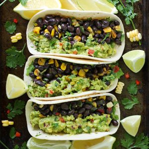 Veggie-loaded and flavor-loaded with lots of guacamole, black beans, corn, and peppers, these vegetarian guacamole tacos are full-on yummy. They’re naturally vegan and dairy-free, too. Perfect for Taco Tuesday!