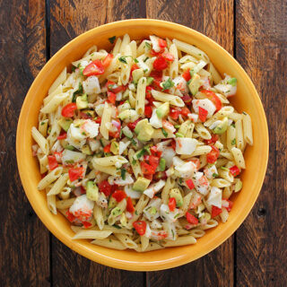 Finally, a bit of confession time: I couldn’t find lump crab at my grocery store. Oh, they had crab legs — as in … legs … long, spindly, and frozen — but I was just making this avocado and crab pasta salad for lunch, and I didn’t want to mess with anything frozen. Or long and spindly. So, I reached for a package of imitation crab. Which I’ve actually never had before. At least, not intentionally.