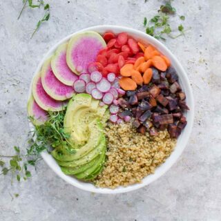 A Buddha Bowl is satisfying and nutritious, but one of the things I love most about them is that they’re just beautiful. As the cliche goes, first we eat with our eyes, and it’s impossible to look at this bowl and not want to dig right in.