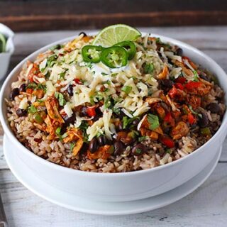 - To serve, spoon rice into bowls, followed by the chicken mixture. Top with sour cream, cilantro, and cheese.