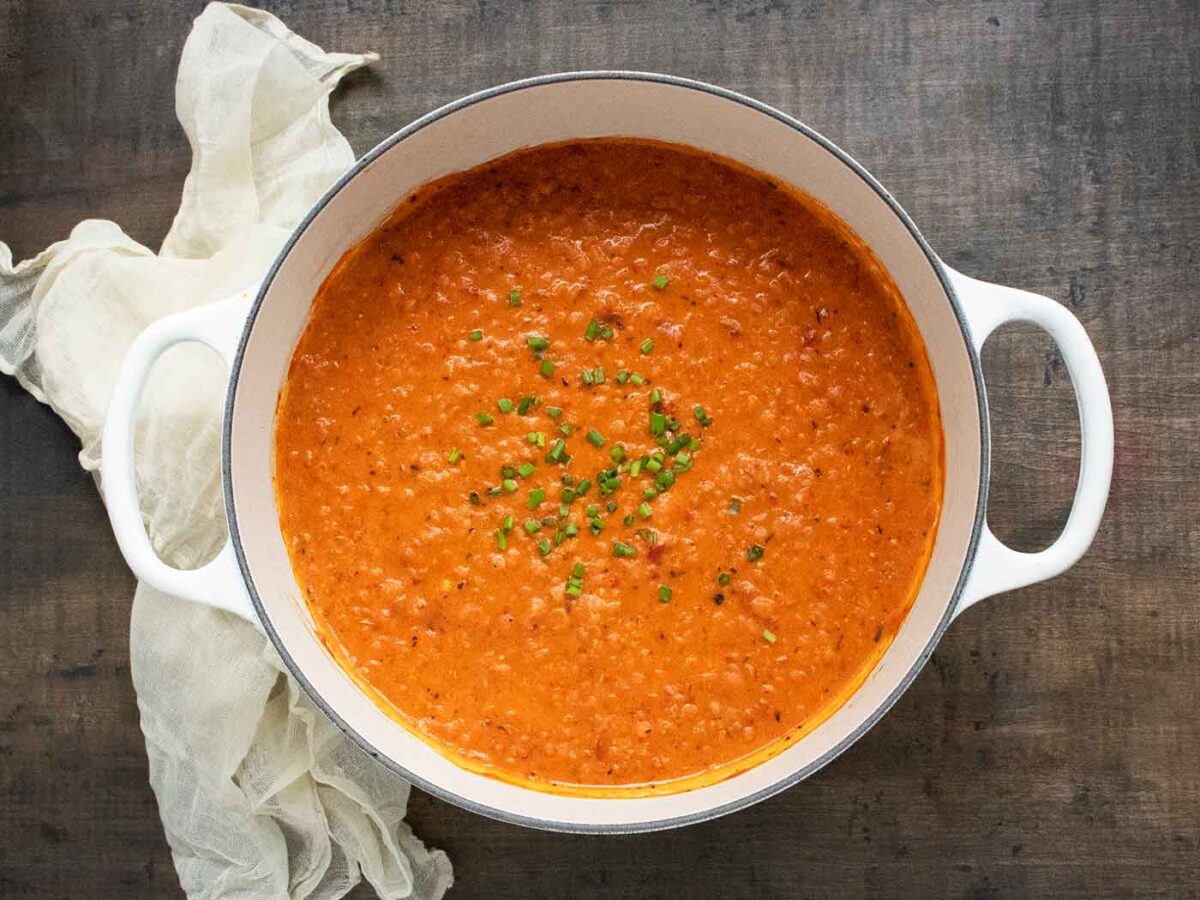 Creamy, flavorful, and easy to make, this lovable lentil soup takes the iconic sun-dried tomato base from the viral Marry Me Chicken dish and tweaks it into a hearty and satisfying soup. Smoky bacon, sweet roasted red peppers, and a touch of coconut milk create layers of flavor that will have you falling in love with every spoonful of this Marry Me Red Lentil Soup.