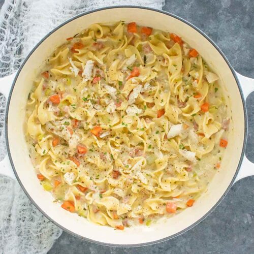 Delicious Creamy Chicken Noodle Soup with Pancetta goes from stove to table in under an hour and is super easy to make with leftover cooked or rotisserie chicken.