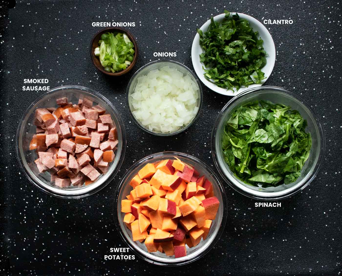 - Heat the oil in a 4-quart soup pot or Dutch oven over medium until the surface shimmers. Add the onions, sweet potatoes, and smoke sausage and saute until the onions have softened and the smoked sausage has cooked through (about 10 minutes).