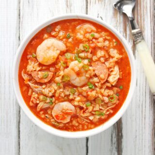 This Creole-style Jambalaya Soup is beautiful taste of the Big Easy, in comforting soup form, perfect for a cozy dinner at home or for serving a crowd after Mardi Gras festivities. With homemade-in-the-pot chicken broth, chicken, sausage, shrimp, tomatoes, and paprika, this soup is will satisfy your cravings. Make it on Sunday and serve it on Fat Tuesday — it’ll be even better!