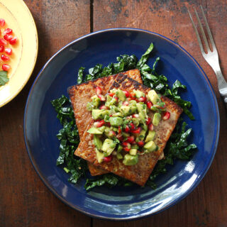 - To serve, line 2 plates with a thin layer of massaged kale. Arrange 2 pieces of the tofu on the kale, and spoon the avocado pomengranate salsa on top. (For 4 appetizer-sized portions, use one piece of tofu per plate.)