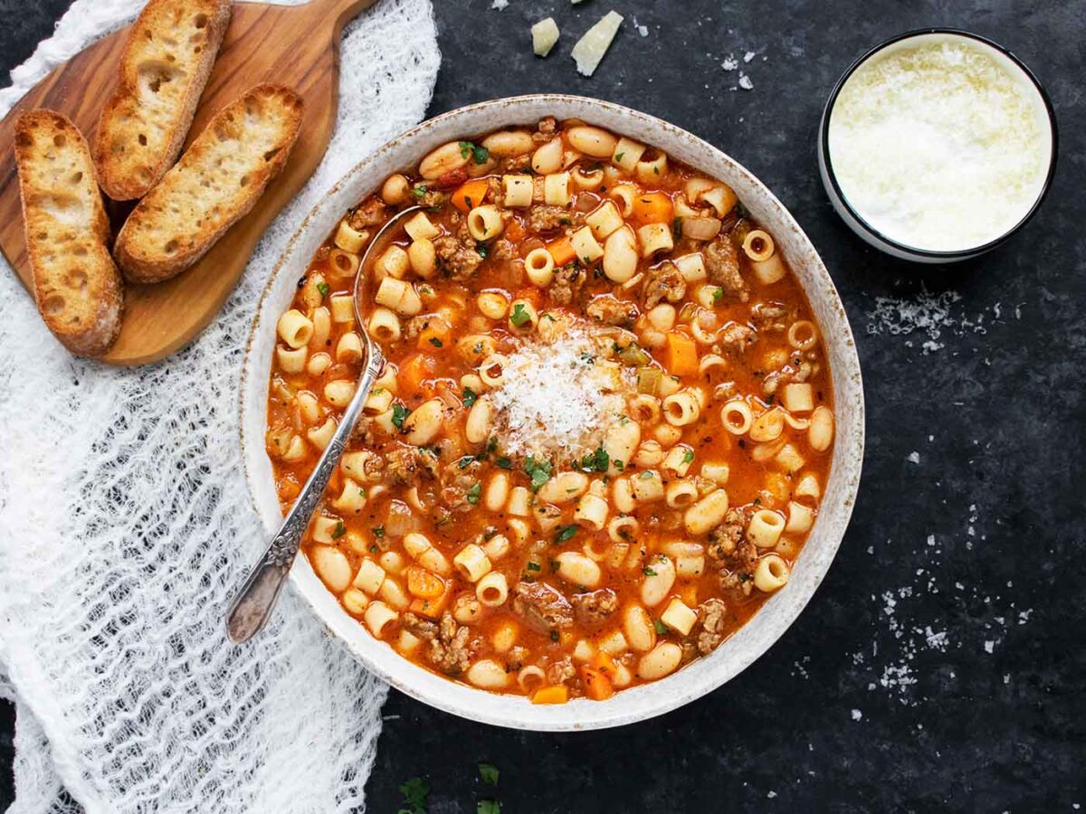 Pasta e Fagioli brings all the carby comfort you need when you've got those can't-be-denied pasta cravings. This beloved Italian classic combines savory sausage, tender white beans, and lots of pasta in a deeply flavored tomato-based broth that's both hearty and satisfying.