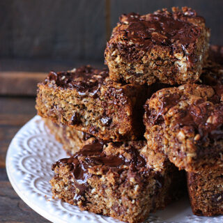 I’ve been wanting to bake peanut butter chocolate oat bars for a while now, and feeling might guilty about it. Spring is here, and I should be wanting to make dainty little granola bites, or something at least within walking distance of “healthy.” But, every weekend, I wheeled my cart past the machine on the way to the bulk bins for quinoa and sunflower seeds, and dreamed about mile-high oat bars full of savory-sweet honey roasted peanut butter and lots and lots and lots of melty chocolate.