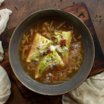 Soy sauce, a parm rind, and miso add plenty of umami notes that make the broth delightfully sippable. Topping the roasted cabbage with more cheese and bacon wraps the whole soup in loads of flavor.