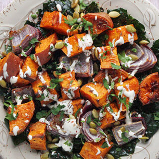 Inspired by a recipe from Yotam Ottolenghi, this is possibly my favorite way to enjoy roasted sweet potatoes: a turn in the oven, along with some red onions, then layered on massaged kale (all three from the backyard garden), drizzled with an addictive tahini dressing and topped with herbs, za’atar and crunchy pepitas.