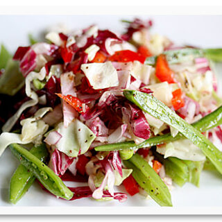 - Place cabbage, radicchio, red bell pepper, sugar snap peas, and onion in large bowl. Add dressing and toss to coat. Chill before serving.