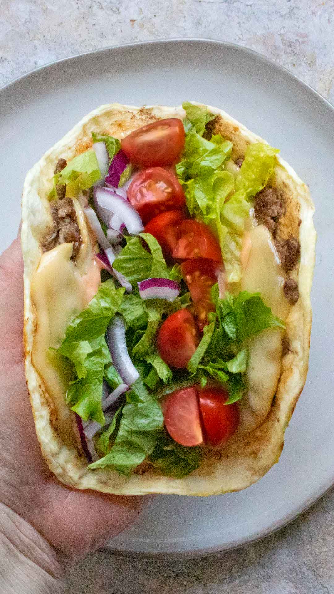> Press the beef into the tortilla shell   > Cook the beef until well-seared   > Flip and melt the cheese   > Load up the taco with your favorite fixin's