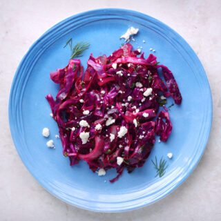 A satisfying main dish for veggie-loving folks like me, this wilted red cabbage also makes a spectacular side with its neon purple coloring flecked with green and white.